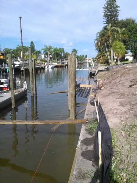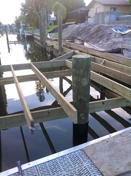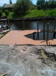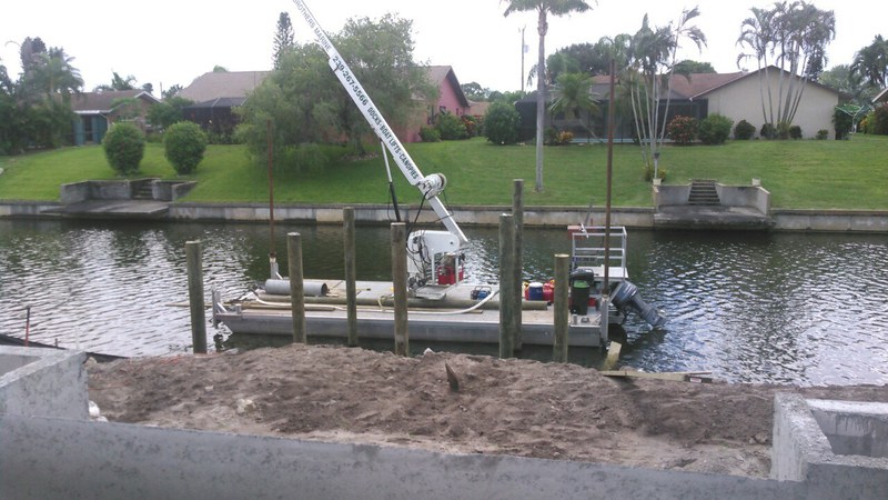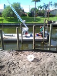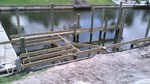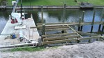 Parallel zum Bau des Dachstuhls durch die Zimmermänner wird heute mit den ersten Arbeiten für unser Bootsdeck begonnen. Dafür müssen erst die Tragpfeiler (Pillings) mit einem speziellen Bootskran und Gewichten tief und fest in das Sediment des Kanals eingetrieben werden. Zwischen diese Pillings kommt dann die Querträgerkonstruktion, auf die später die Planken genagelt werden. Hört sich alles sehr einfach an, ist es aber nicht.