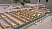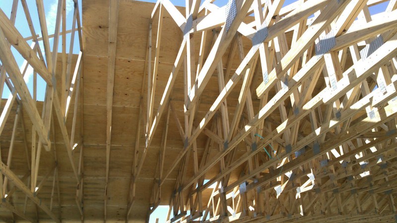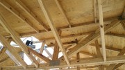 Nun beginnt es im Inneren des Hauses dunkel zu werden. Die Arbeiter nageln bzw. schießen die Bretter der Unterkonstruktion auf den Dachstuhl und schließen so selbigen.