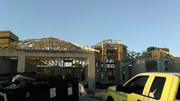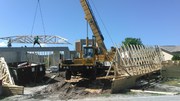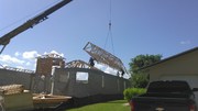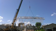 Das Dach wächst und wächst :-) Heute war der Kran da und hat die fertigen Elemente in Position gehoben. Achtet mal auf die (nicht vorhandenen) Arbeitssicherheitsmaßnahmen der Männer, die beim ausrichten der Holzsegmente auf den Mauern stehen.